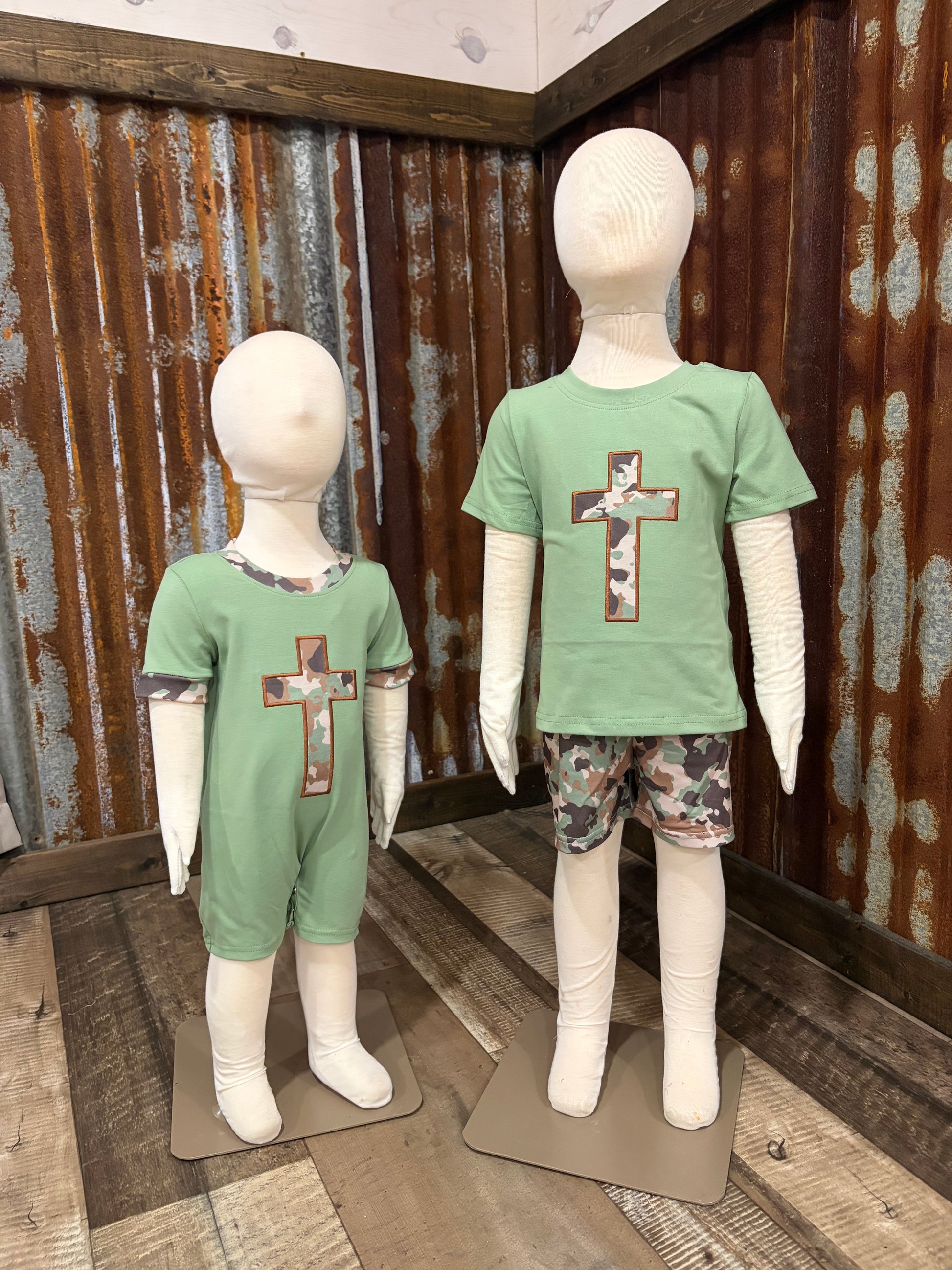 This charming romper brings together faith and fun with a striking camo cross appliqué that's perfect for playtime or Sunday service. The trendy camouflage pattern adds an adventurous vibe while the bold cross keeps the spiritual message front and center. Designed for comfort and style, it's an easy-to-wear piece that lets little ones express their personality with purpose. Whether heading to church or the playground, this outfit makes a sweet statement that's sure to turn heads and warm hearts.