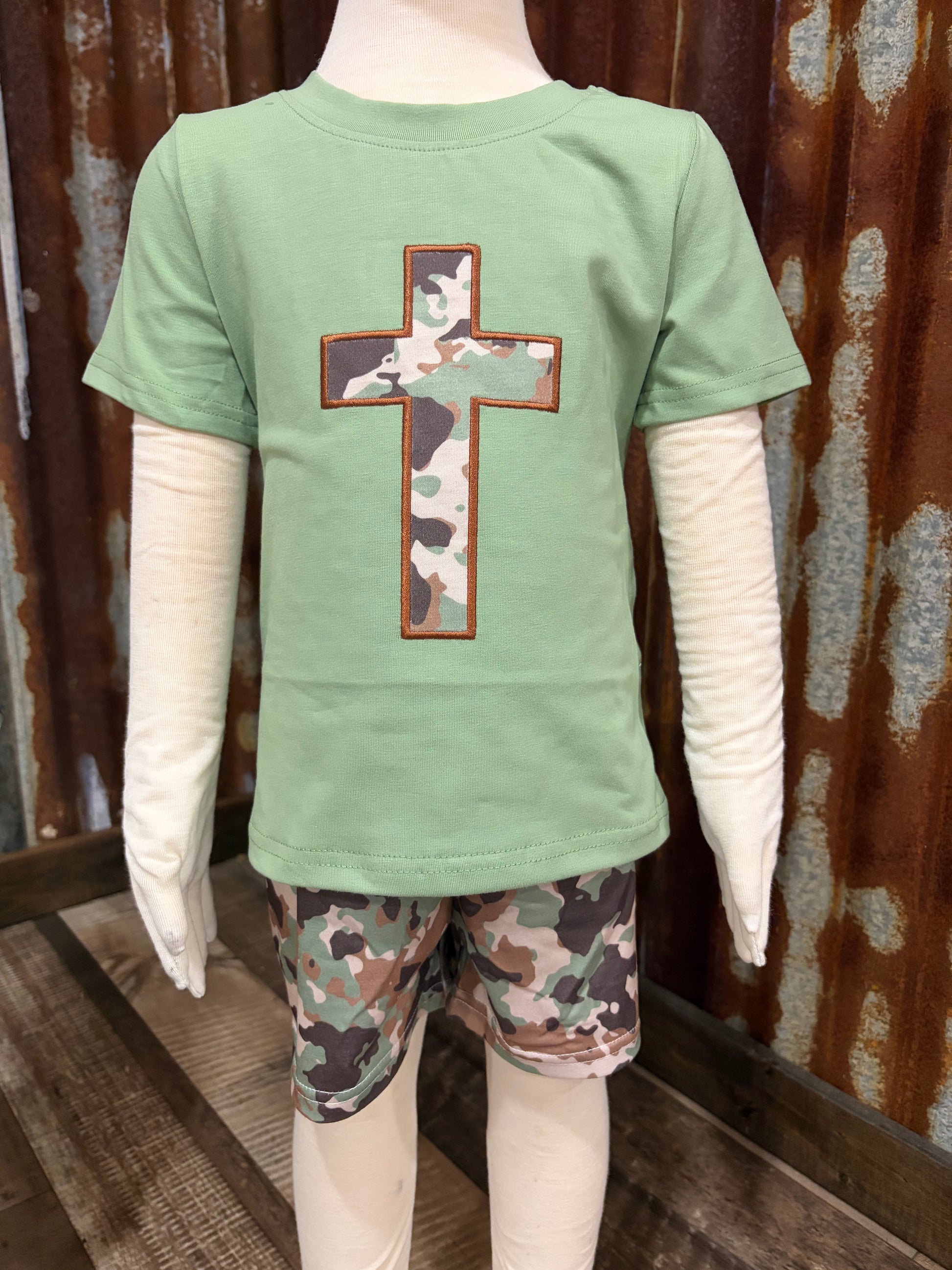 This charming set brings together faith and fun with a striking camo cross appliqué that's perfect for playtime or Sunday service. The trendy camouflage pattern adds an adventurous vibe while the bold cross keeps the spiritual message front and center. Designed for comfort and style, it's an easy-to-wear outfit that lets little ones express their personality with purpose. Whether heading to church or the playground, this outfit makes a sweet statement that's sure to turn heads and warm hearts.