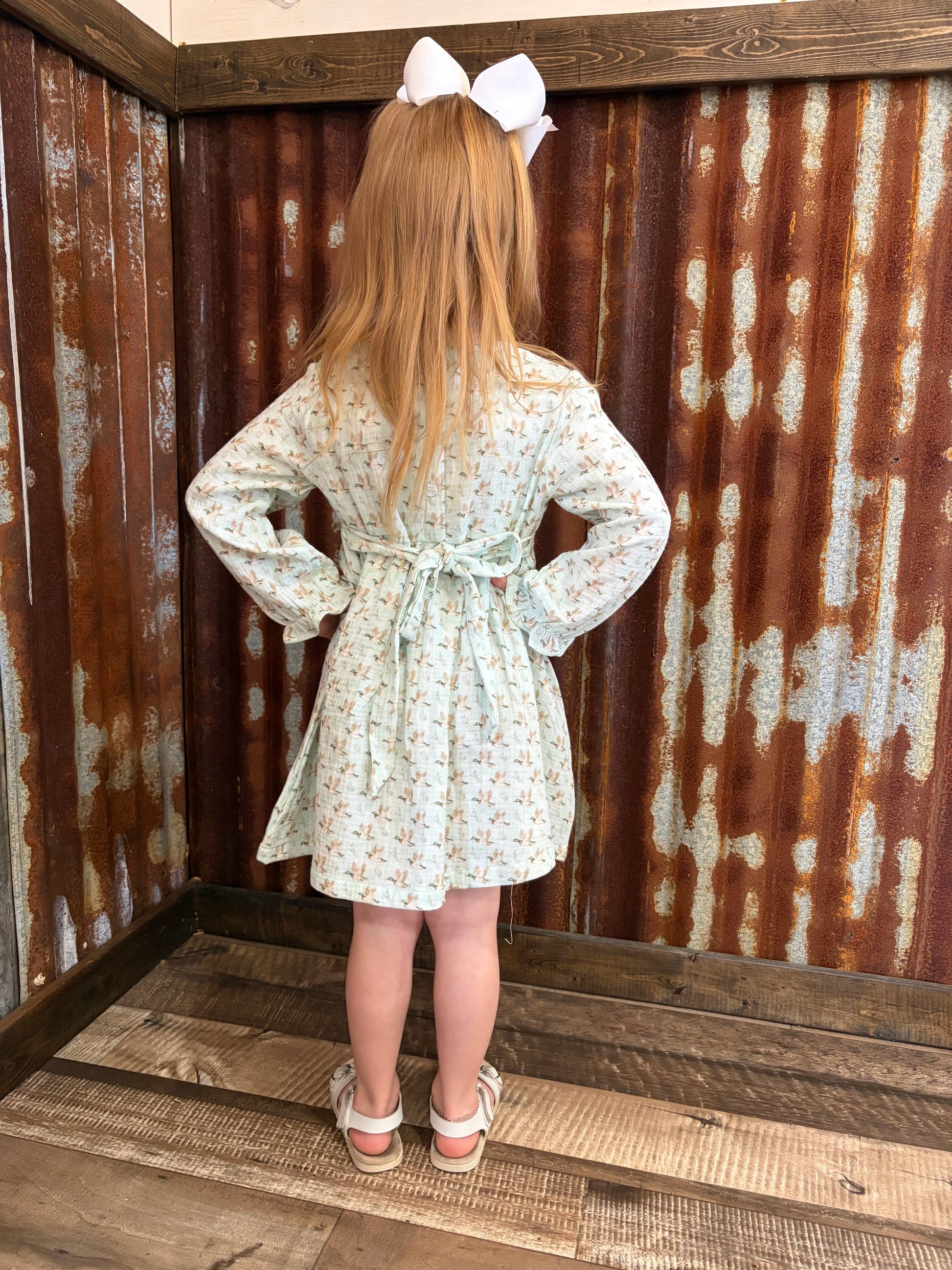 This charming little girl dress features an adorable mallard print that brings a touch of whimsy to any day. Made from soft, breathable muslin, the dress offers lightweight comfort perfect for twirling and play. Its playful design and gentle fabric make it an ideal choice for warm days filled with fun and adventure.
