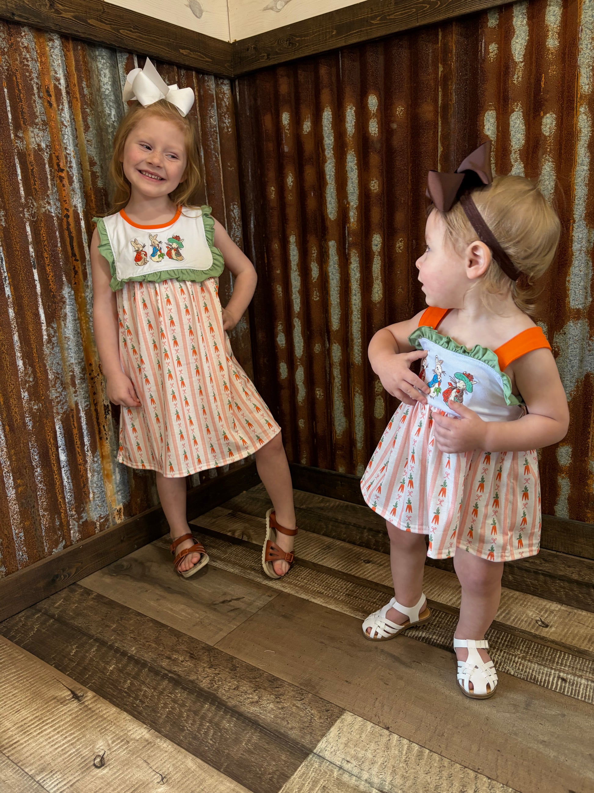 Hop into spring with this darling dress featuring precious Peter Rabbit embroidery that captures the magic of classic storybook charm. Whether hunting Easter eggs or enjoying a sunny spring day, this outfit brings whimsical character to every adventure. The sweet embroidered details add personality and nostalgia, while the comfortable style keeps little ones moving freely through playtime. Perfect for creating memorable moments and picture-perfect memories this season. A delightful choice for parents who love timeless, storybook-inspired fashion.