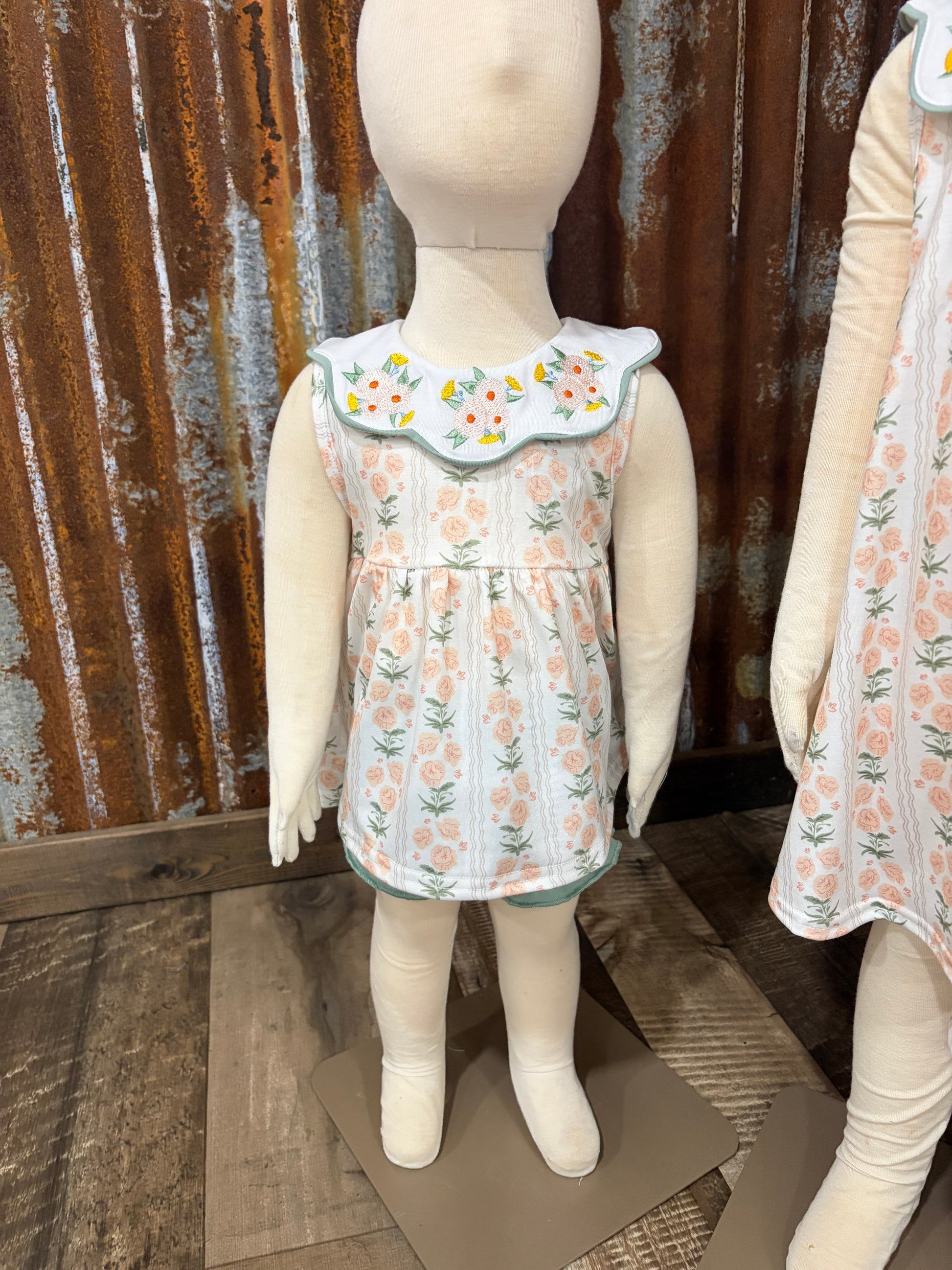 Step into a garden of glam with the Petals and Sage Bubble! This dainty floral delight, complete with an adorable bishop collar and embroidered flowers, has your back (and front) for any soirée. Get ready to twirl like nobody's watching—because in this bloomer set, your little will be a flower child!