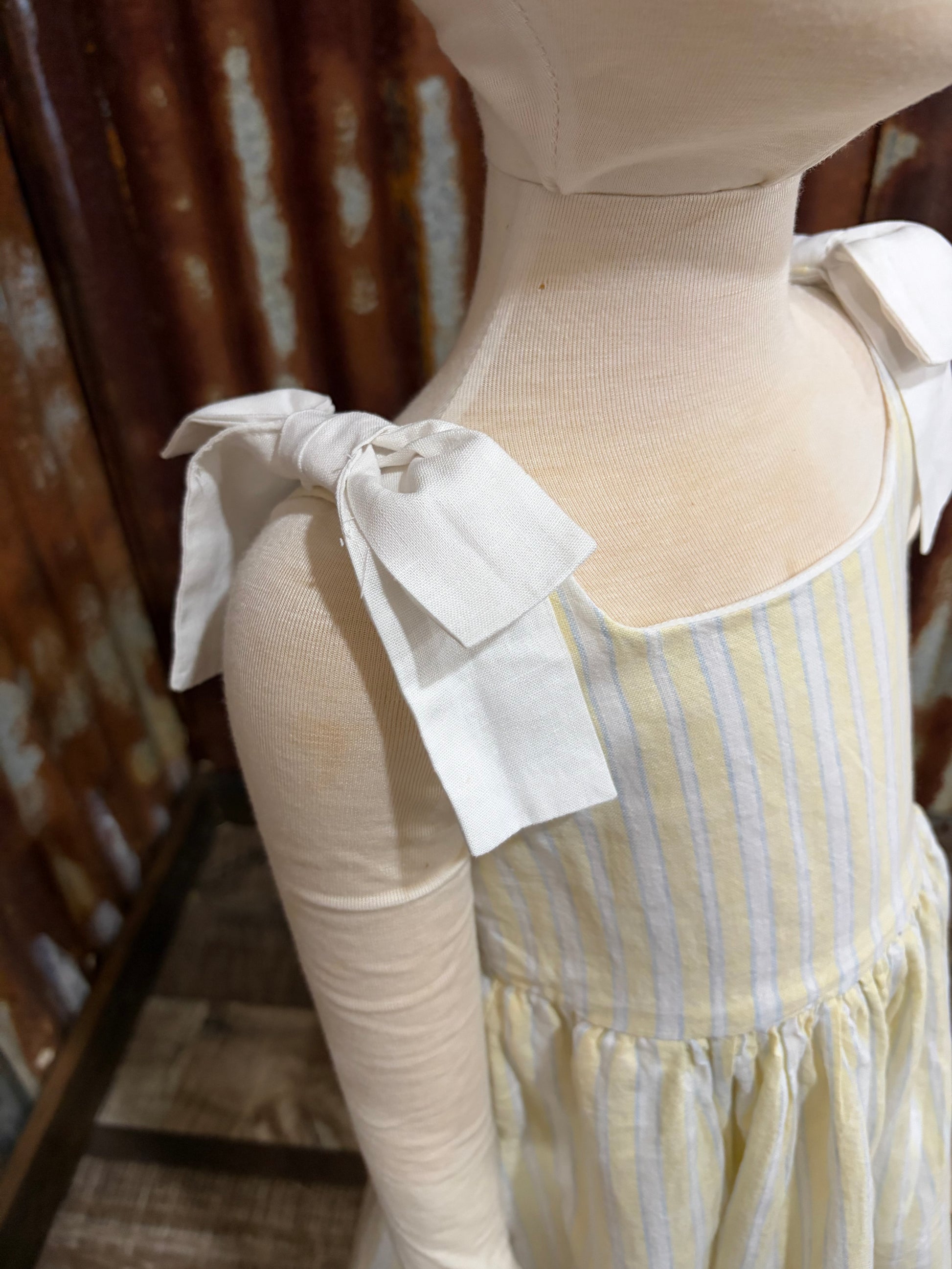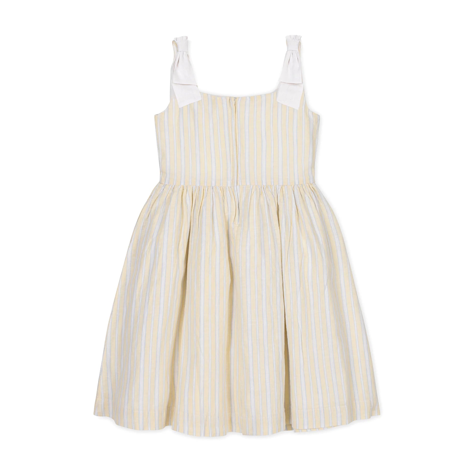 Twirl into sunshine with this cheerful striped dress! Crafted from a breathable blend of 45% organic cotton and 55% linen, it's perfect for warm days and carefree adventures. Adorable bow details add a touch of whimsy to the pale yellow stripes, making this dress as fun to wear as it is comfortable. Whether you're heading to a picnic or a playdate, this little stunner brings joy and style in every step.