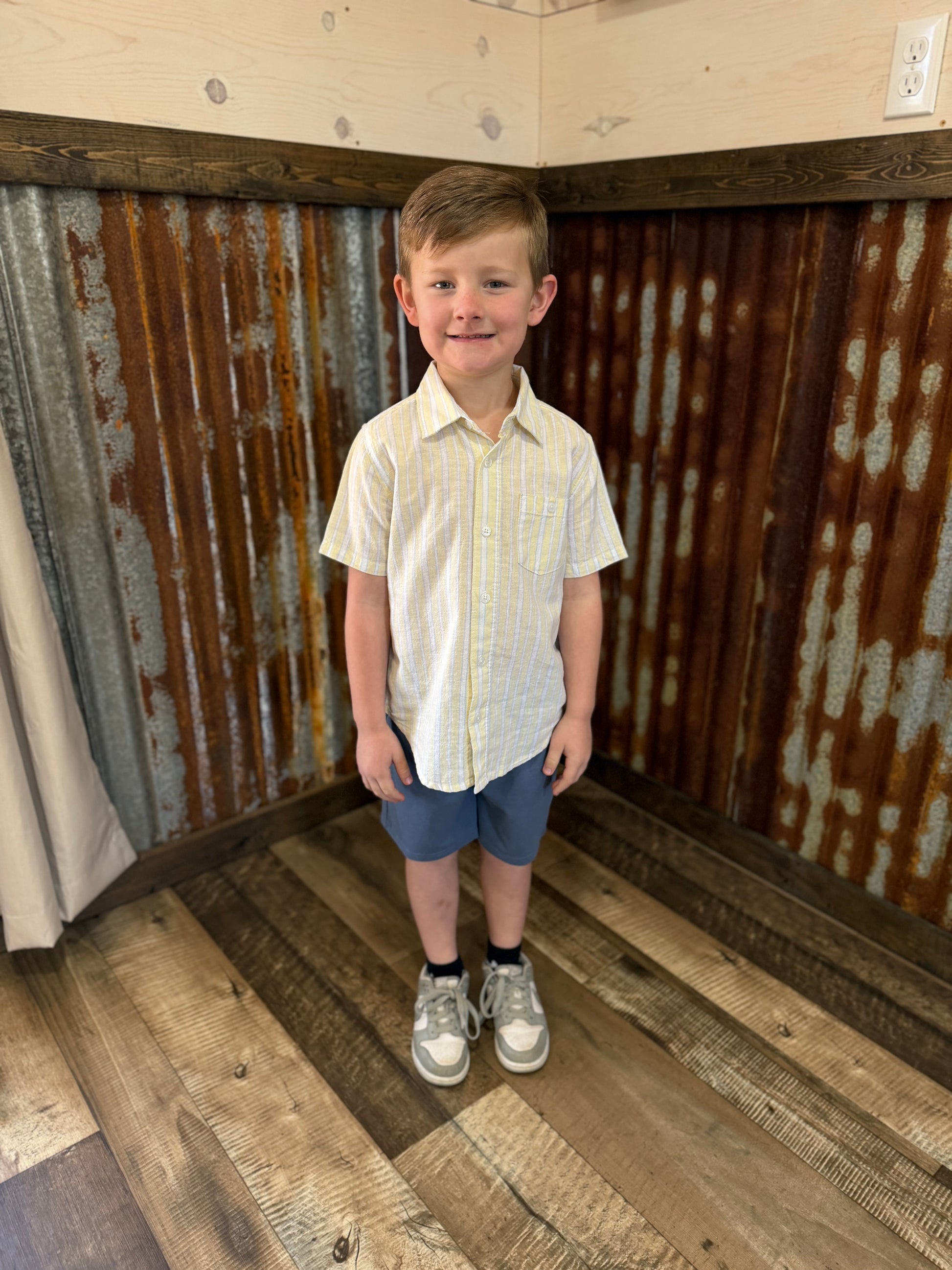 Meet your new Easter wardrobe essential! This charming Sunshine Striped Short Sleeve Button Up blends 45% organic cotton with 55% linen for a breathable, comfortable fit that's perfect for spring celebrations. The classic striped design captures that sweet, traditional Southern aesthetic, while the quality construction ensures this piece becomes a cherished heirloom your little one will treasure for years to come. Dress it up for holiday photos or keep it casual for everyday adventures—either way, it's pure sunshine and smiles.